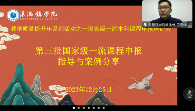 (本网讯:朱梦琪)为全面提升我校人才培养质量,充分发挥一流本科课程的示范与引领作用,12月25日,教务处邀请了上海交通大学教务处课程建设负责人余建波教授在腾讯会议平台上为我校教师举行专题讲座。各学院分管教学副院长、专业负责人、课程申报团队成员、音乐舞蹈学院教师、教务处工作人员参加培训会,活动由教务处负责人司春灿主持会议。