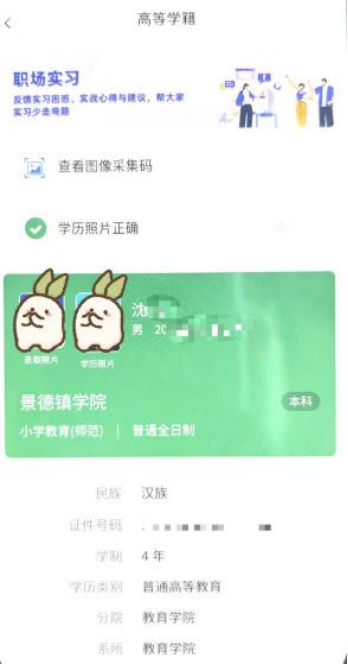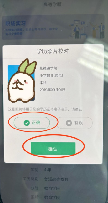 步骤2:校对学籍信息(包括姓名、性别、民族、证件号码、专业等),如无错误,点击【学历照片正确】 |