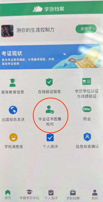 步骤1:点击学信档案中【毕业证书图像校对】 |