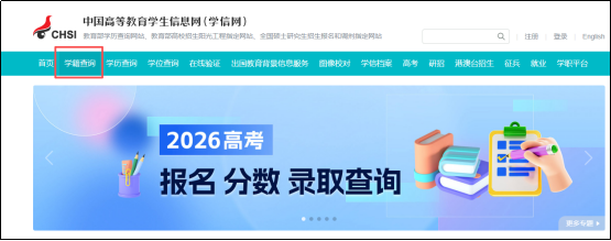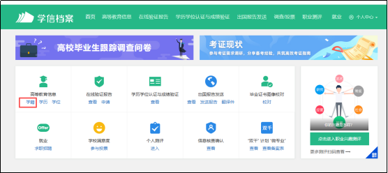进入学信网首页,点击导航栏中的【学籍查询】或【学信档案】进入“学信档案”界面。