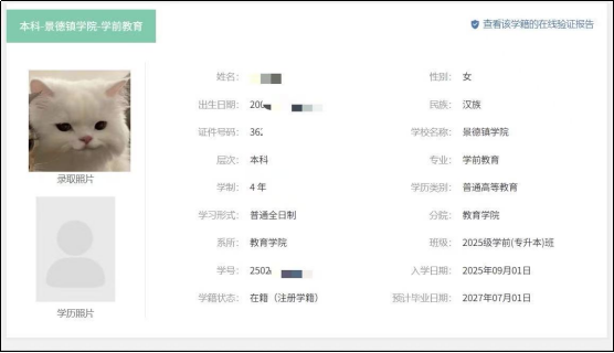注:1.因江西省专升本层次的专业设置是以教育部《普通高等学校本科专业目录》为标准,专升本学生学制统一为4年,学籍信息显示学制为4年属正常情况。2.因学信网上传班级、学院名称有字数限制,故新生班级名称均为简称,部分联培学校名称缩写,均属正常情况。3.在校生暂无学历照片,学历照片将于毕业生图像采集工作完成后进行核对。